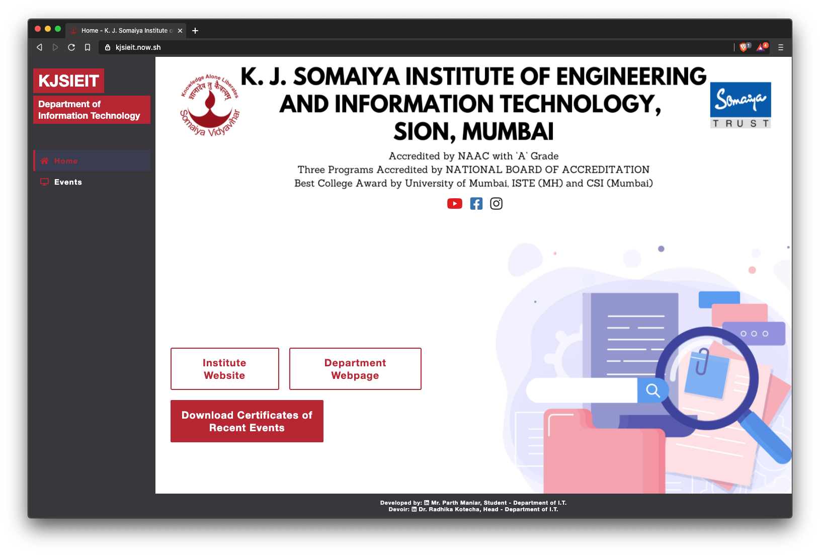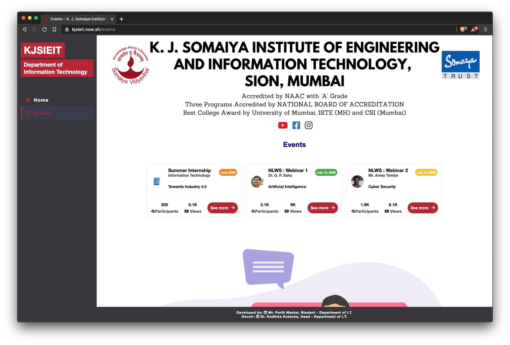 KJSIEIT Department Site developed that enables users to access resources, recordings and certificates for webinars being conducted by the department. The application also gives an overview of the department.