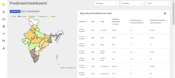 India is a nation in which about 58% of our population relies solely on agriculture as a source of livelihood. It holds a crucial role in our country’s growth and development. Even after having a high direct impact on our economy, we tend to face multiple challenges in the field of agriculture. The uncertainty in weather directly impacts the agriculture industry in several ways, this can further lead to a deficiency in food grains owing to crop failure and hence lead to situations such as a sudden rise in crop prices. There are systems that have been developed on the lines of prediction of the weather and crop production, however, none of the systems provide a common, unified platform for the analysis and prediction of all the various parameters which contribute to the agriculture industry. One of the major drawbacks of the existing systems is that none of them have taken into consideration all the possible parameters which influence the optimization of crop yield in the agriculture industry. Weather conditions, area of land, available warehousing, etc, are a few of the many factors which heavily contribute towards the fluctuations in prices and availability of crops. Hence, taking into consideration all of those attributes is essential for the prediction of yield, weather, and pricing of crops. Furthermore, to ensure the reliability of the system, one must train the model on real, government-generated data sources. This was another factor missing in the existing systems since most of them build their models on dummy data. These models did provide good levels of accuracy but failed to put forward a more reliable system. Moreover, the analysis of all the historical data available would also aid the government in the allocation of money and budget planning. The pre-existing systems lack a unified approach of showing the impact caused on external factors such as the budget, crop rates, and available warehousing spaces.