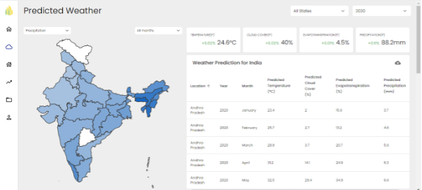 The portal of USAPA will show the map-wise representation of weather, yield, and production data alongside a summary of every visualization which will have the percentage increase and decrease based on the coordinates of that location. The historical crop production data for 343 districts based on parameters of production, yield, and cultivation area is represented graphically on the portal. The collected historical data will provide insight and analysis into the different trends present in the data alongside the production data. Every module’s dashboard provides the predicted as well as historical data visualizations for the parameters taken. The price prediction will aid the government in budget planning, policy framing, guiding agro-industries and farmers. The warehousing module will showcase all the major warehouses located district-wise along with their storage capacities. Since the system is built using 13 major algorithms, wherein there is a different model for each crop per district along with huge data files, the aspect of storage and scalability is essential. MongoDB and Amazon S3 are being used to store the data which also helps in ensuring the security and cost-effectiveness of the system. The system will be dockerized, giving a consistent and isolated environment with fast deployment and mobility. The user-friendly interface will allow every user to easily be able to understand the portal. Furthermore, the admin will have the option to generate the predictions for forthcoming years by selecting the state and year. The admin can also upload the missing or new data files which are not already used in the portal to see the predictions made accordingly. Overall, USAPA will bring forth a unified platform for all the major agriculture predictions and historical data visualizations together.